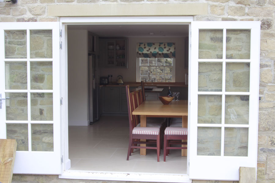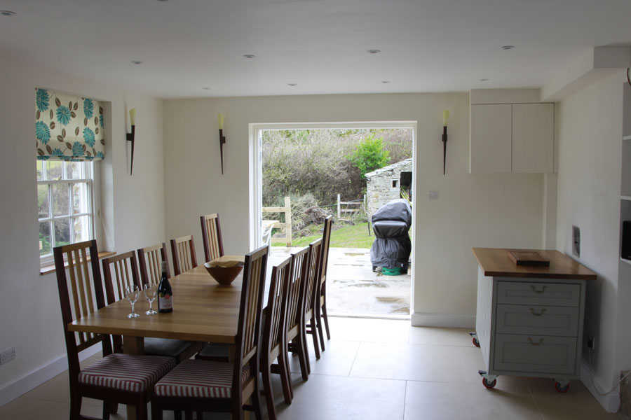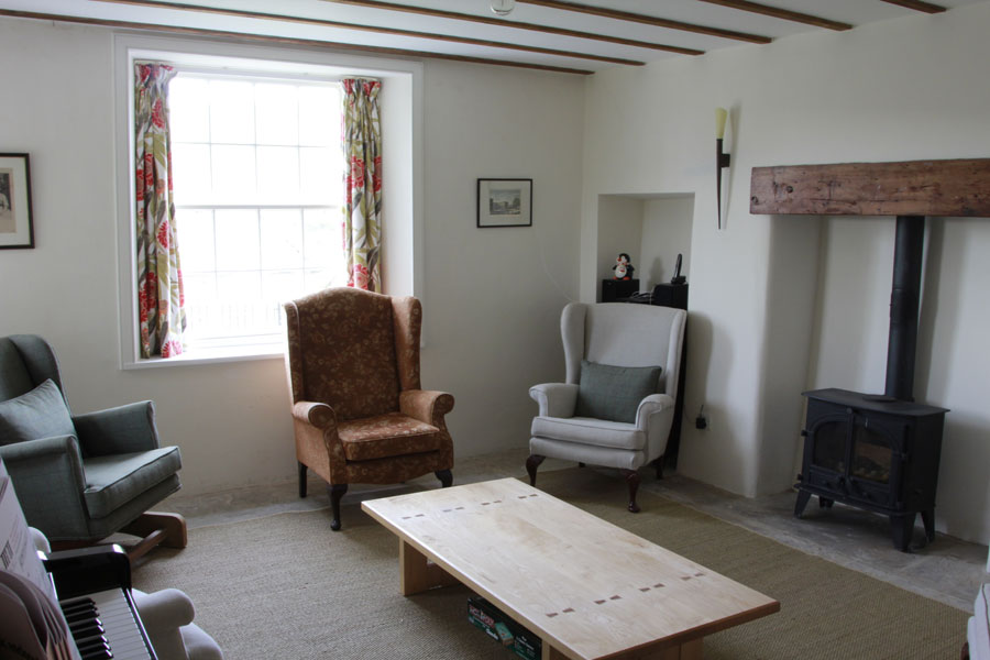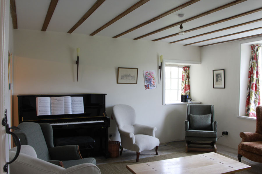 There are two fully equipped bathrooms upstairs (one ensuite). Downstairs are two sitting rooms: a common room with TV/DVD, and a parlour with piano. There’s also an old pantry converted to a study with functioning PC, landline telephone and broadband. A utility room accommodates the heat pump, as well as sink, toilet, washing machine and dryer. The large modern kitchen opens through French windows onto a sheltered garden patio, and an undulating landscaped garden with a natural water feature and fruit trees.